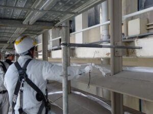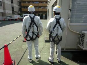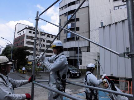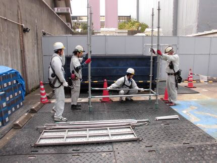 上の写真は、足場の組立て説明を受け、実際に生徒さん自身でも組んでいる様子